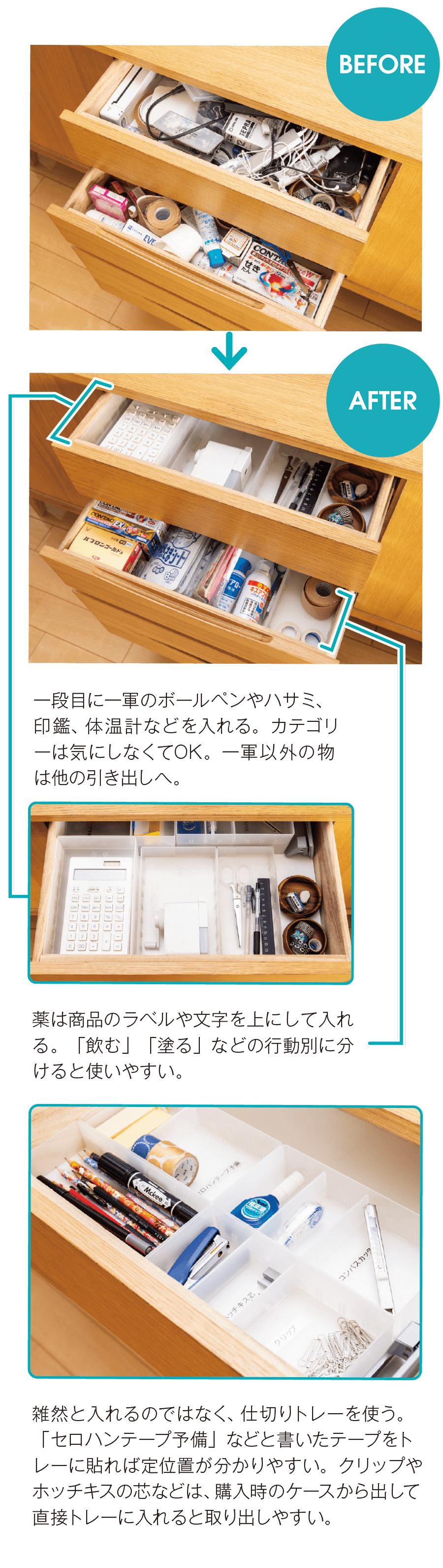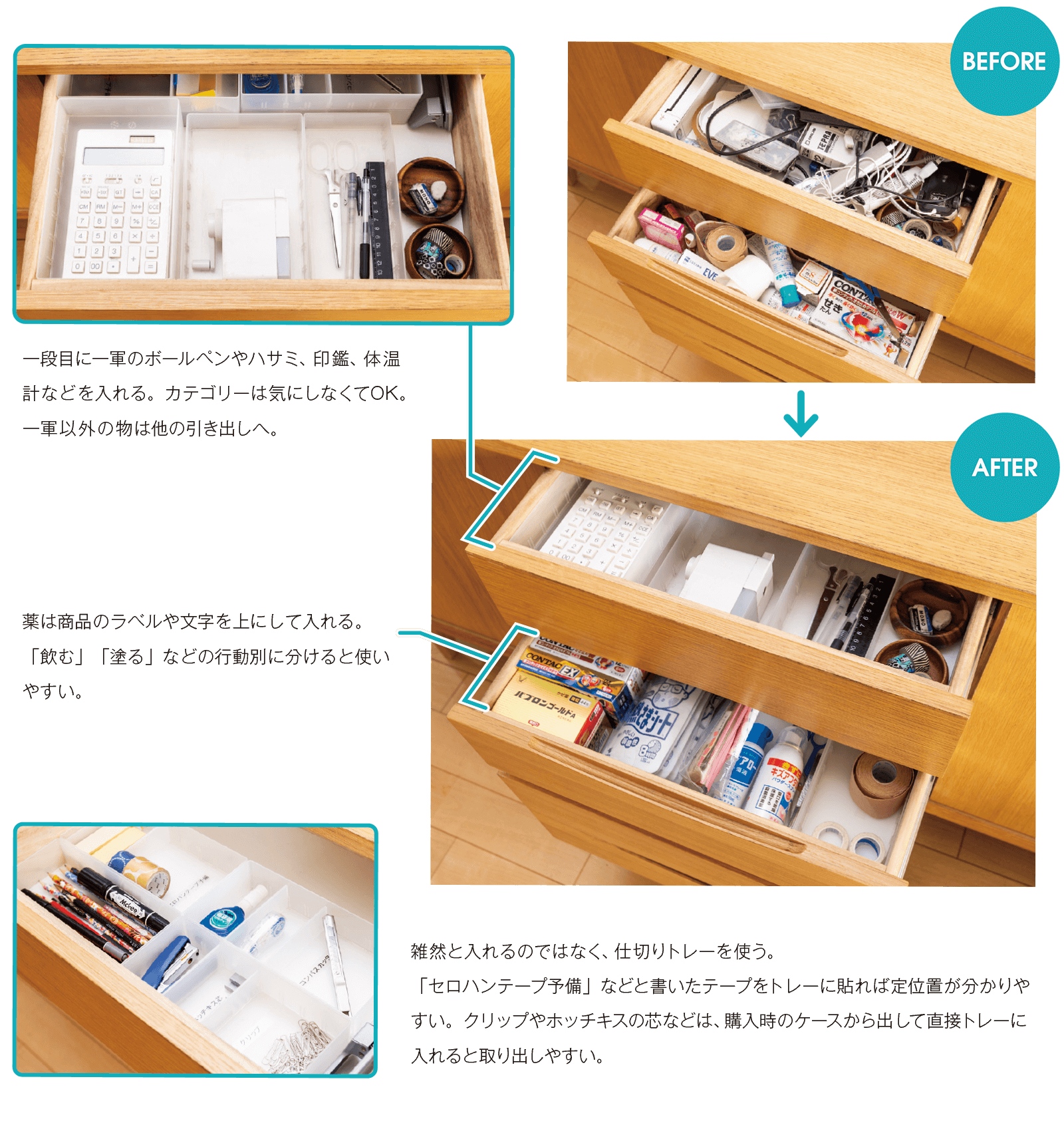リビングなどにある引き出しは、家族がいろいろな物を入れるので散らかりがちです。 ボールペンや印鑑など、よく使う物を一軍として、一段目や取り出しやすい引き出しに入れましょう。