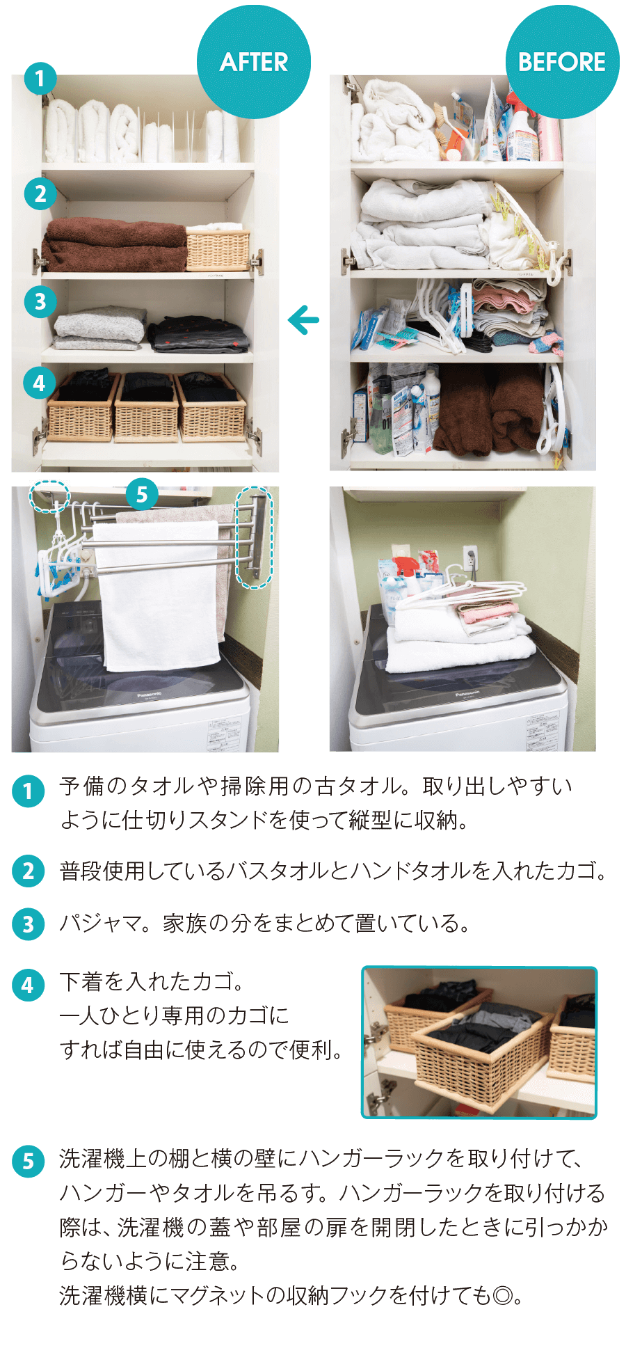 タオルは枚数(一人バスタオル2枚ずつ+ハンドタオル4枚など)と交換時期(半年に1回など)を決めましょう。古いタオルを使い続けたり、新品のタオルをしまい込んだままにすることがなくなりますよ。