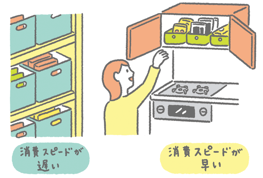消費スピードが早い食品はキッチン、遅い食品はパントリーに、など消費スピードで分類する方法もあります。自分や家族が管理しやすい収納法を探してみましょう。