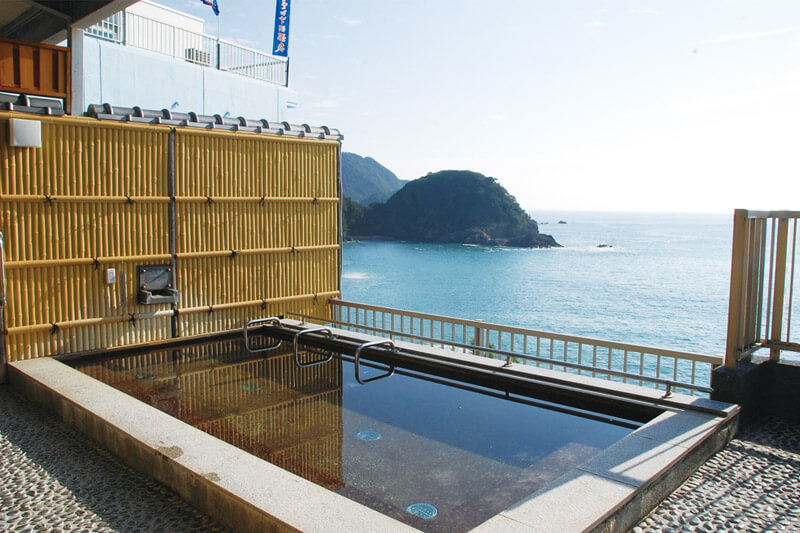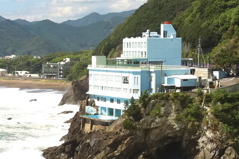 大浜海岸のある日和佐湾を望む高台に建つ、全室オーシャンビューのホテル。ウミガメ観察の宿にはぴったり。天然露天風呂はインフィニティプールのような眺望、日帰りでも入浴することができる。地元の魚介をふんだんに使った料理は絶品で、秋から伊勢海老のプランも用意される。