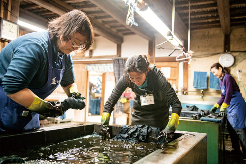 藍汁の中に布を入れ絞る、染めの作業。
