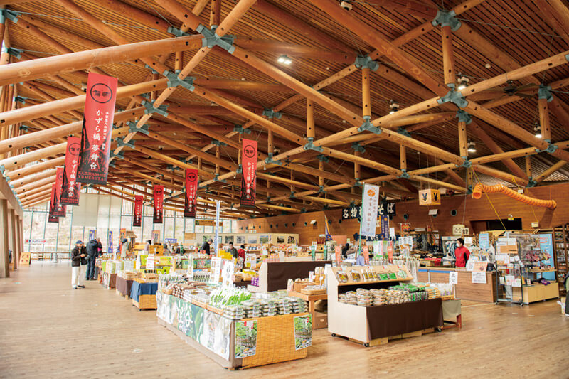 「かずら橋夢舞台」は、祖谷のかずら橋から徒歩5分にある大型観光施設。広い空間を存分に使った物産コーナーは、そばや和菓子を始めとする食品や野菜の他、衣類、雑貨など、祖谷にゆかりのある品々が所狭しと並びます。