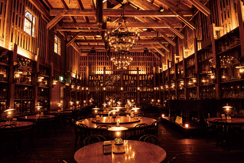 100年以上前の木骨石張倉庫を改装した北一ホールは、石油ランプのみの照明。