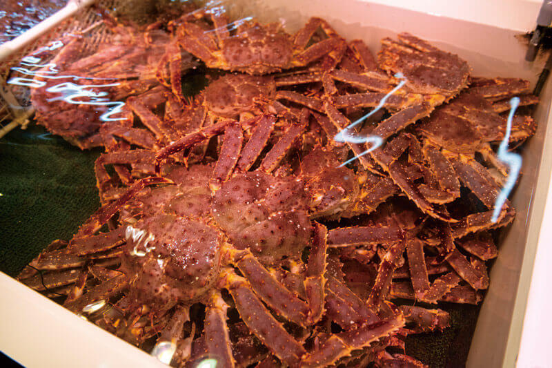 新鮮なタラバガニや毛ガニが生簀に。ウニやホタテなどもお土産に送っても喜ばれる。