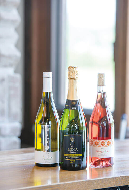 左からRICCA 雪の系譜 シャルドネ3,500円。RICCA スパークリング 4,320円。 宝水ワイン オレンジピンクロゼ 2,050円。いずれも2017年もの、税込。
