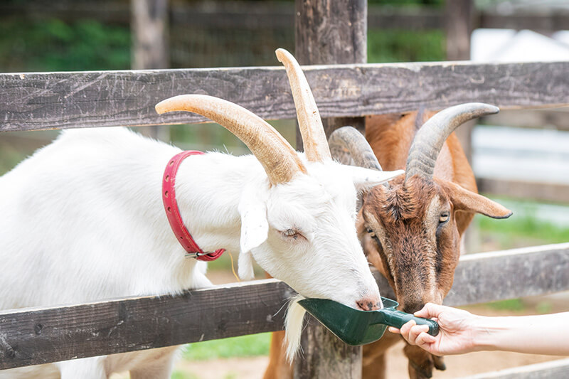 丹後の農家から直送される新鮮野菜が並ぶ「愛菜館」。ゴーカートや芝すべりなどの遊具も充実。ヤギやケヅメリクガメなどの動物たちともふれあえる。