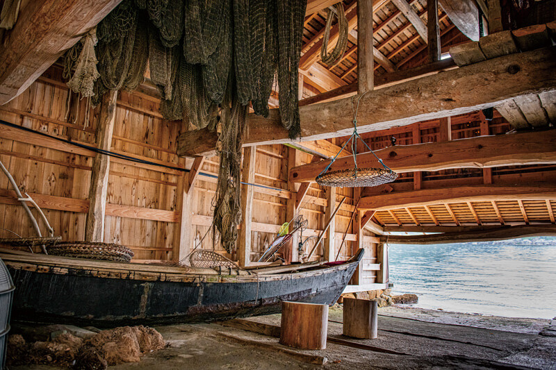京都市内から車で北へ約2時間半、若狭湾に面した漁師町・伊根へと到着します。三方を山に囲まれた伊根湾は、南に面しているので波がおだやかで、江戸時代から漁業が盛ん。湾沿い5㎞にわたって舟屋が230軒ほど連なります。舟屋とは、舟揚げ場と住居が一体になった伝統的な建物のこと。一階は小型の舟を格納するスペース、二階は居室で、道を隔てた山側には母屋があります。漁師たちは、舟屋から直接海に出て漁をし、獲ってきた魚は舟屋でさばいて自分たちの食卓にあがることもあるそうです。伊根町観光協会のガイドツアーでは舟屋の内部を見せてもらうこともできます。