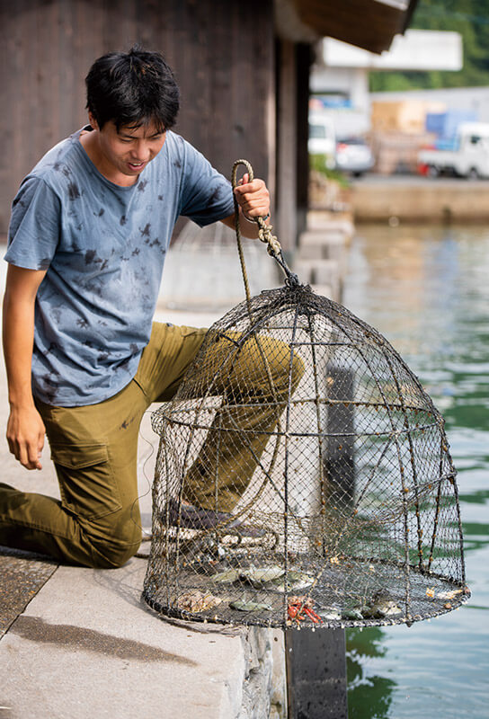 ガイドツアーでは伊根の伝統的な漁「もんどり」体験もできる。もんどりとは、軒下の海底に、エサを入れた大きなかごを仕掛けたもの。ロープを引き上げると、グレ(メジナ)がたくさん!