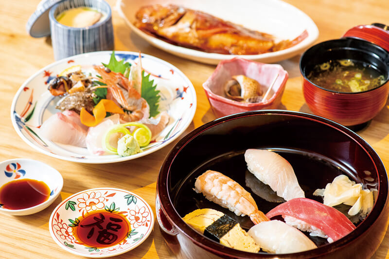 ブリや真鯛など、その日に揚がった魚介をいただける。ランチの「わだつみ寿司御膳」(3,000円・税別)はお造り、小鉢、煮魚または焼魚、茶碗蒸し、寿司5貫、汁物のセット。