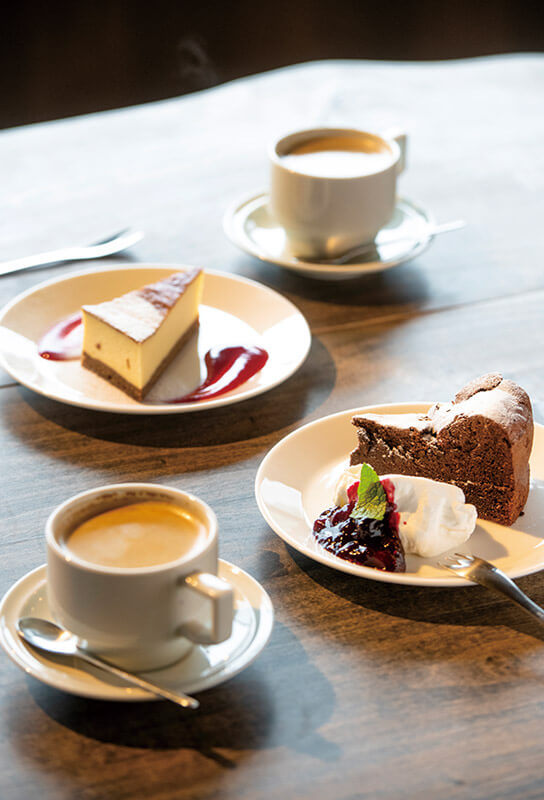 写真は人気のチーズケーキとガトーショコラ。夕方に訪れれば、夕日が舟屋にあたって赤く染まる絶景に出会える。