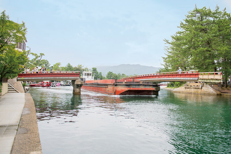 天橋立と陸地をつなぐ廻旋橋。橋が旋回するのは不定期のため、タイミングが合えば見られる。