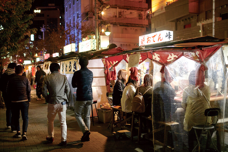 18時頃になると、中洲、天神、長浜エリアに暖簾を掲げた屋台が並ぶ。ラーメン、おでん、餃子、焼き鳥など福岡グルメを味わえる。