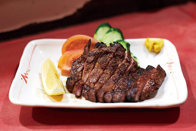 写真は「峰ちゃん」の「国産牛タンステーキ」(1,800円税込)。おでんもおすすめ。