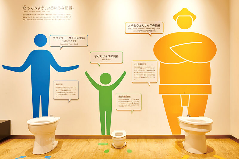 幼児用の便器と力士用の便器は座って通常サイズとの違いを体験できる。