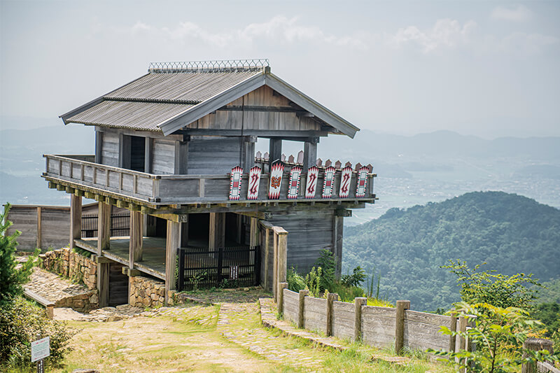 「鬼ノ城」へは、総社市鬼城山ビジターセンターから向かいます。遊歩道を歩いて約10分で到着する「学習広場」(展望デッキ)から「西門」を眺めると、長さ約2.8kmの城壁が万里の長城のように巡る様子を一望できます。さらに10分ほど歩くと、崖のギリギリに建つ「西門」に到着。雨水から城壁を守る敷石や、攻撃に備える「角楼」が現れて、防衛の城だった痕跡を辿れます。