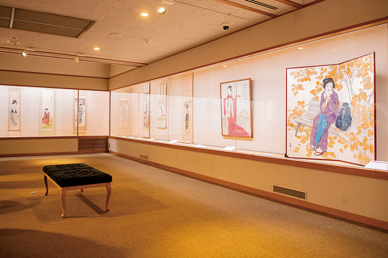 写真は企画展示室。企画展は年4回開催し、テーマに合わせて100点以上もの作品を展示している。随一のコレクションの屏風や掛軸、油彩を見ることができる。