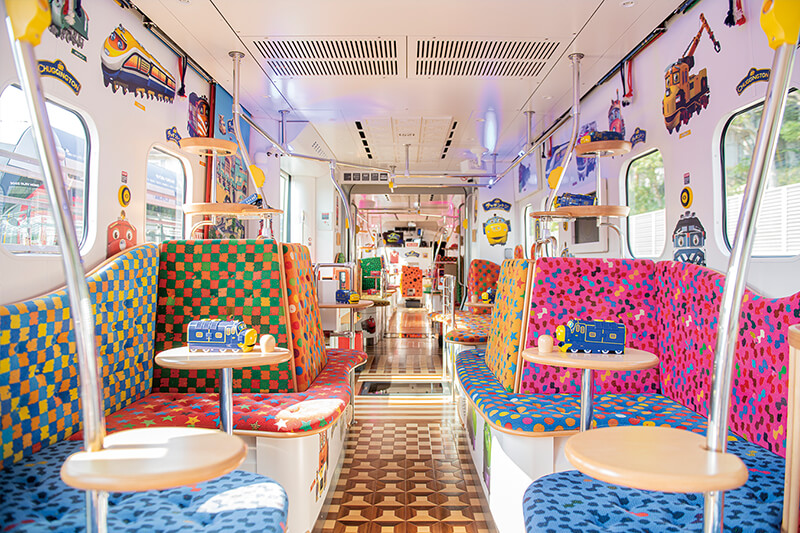 カラフルな車内では、電車ナビゲーターのお姉さんがダンスやクイズで子供たちを楽しませる。
