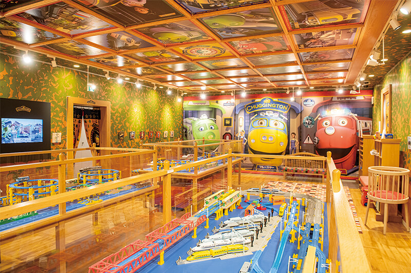 プラレールがたくさんあり、操縦したりレールをつなげたりして遊べる。「おかでんチャギントン」のプラレールなど、オリジナルグッズも販売している。