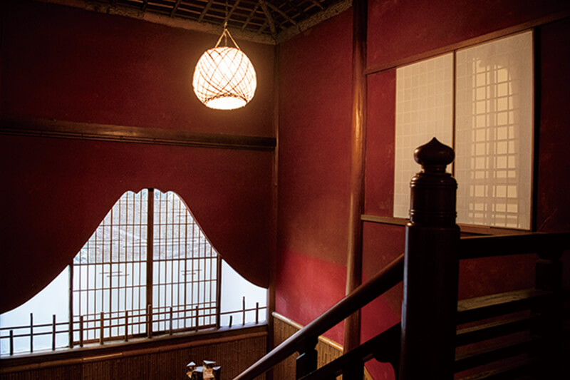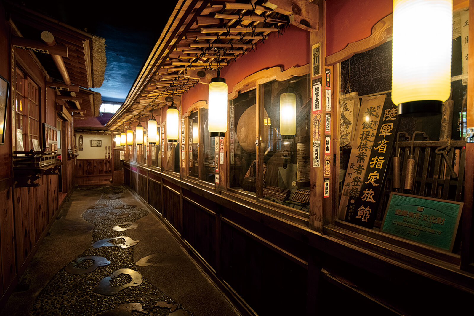 「北光正宗」を購入して、電車を乗り継ぎ渋温泉へ。レトロな雰囲気の温泉街を歩いて向かったのは、老舗旅館「歴史の宿 金具屋」。宿泊者向けの館内ツアーに参加し、9代目西山和樹さんの案内で館内を巡りました。建物は、主に6代目が昭和初期に全国各地から材料を集めて宮大工とともに作りあげました。廊下を屋外と見立てているため、廊下には軒や庇が出て、客室には土間や小窓があります。