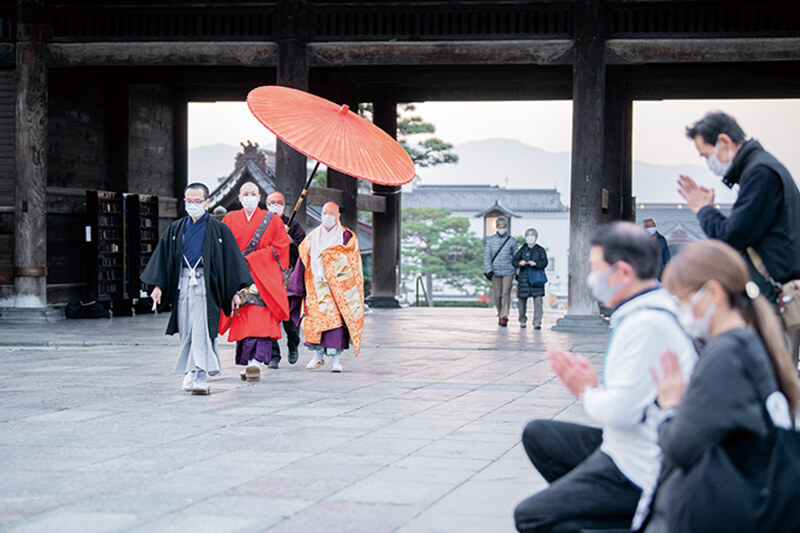 ※「お朝事」の参列は無料。内陣券を購入すると間近に参列できる。開始時間は日の出に合わせて分単位で変わるため、詳細はHPをご確認ください。