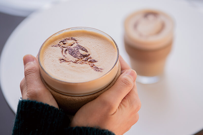 隣接する「イカルカフェ」のカフェラテ(600円)。野鳥のラテアートがかわいい。