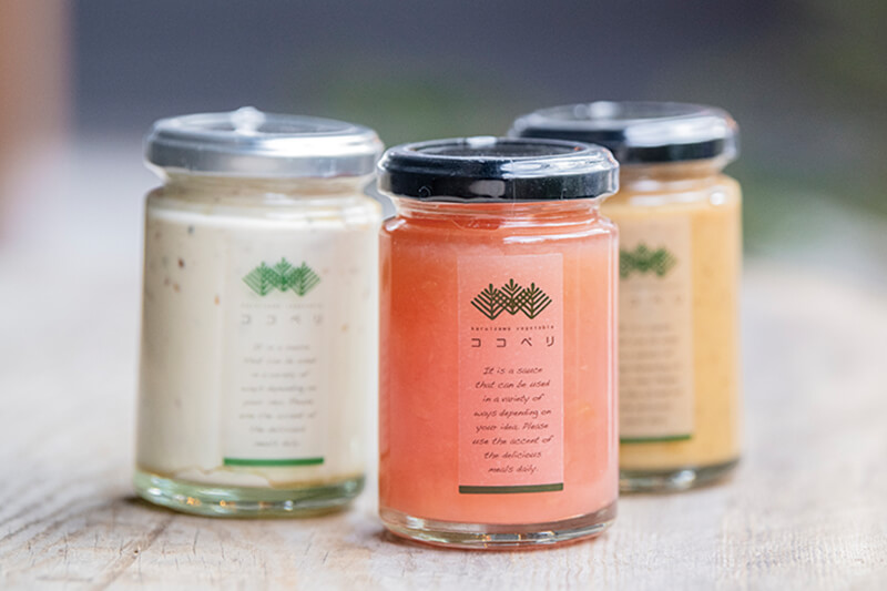 食のセレクトショップ「ココペリ」の人気商品。左は「マヨネーズディップ」で、右2つは「信州産フルーツジャム」