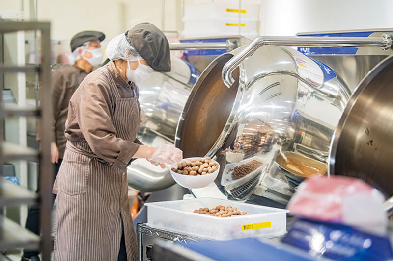 工場で「チョコレートボール」を一粒ずつ丁寧に作っている。