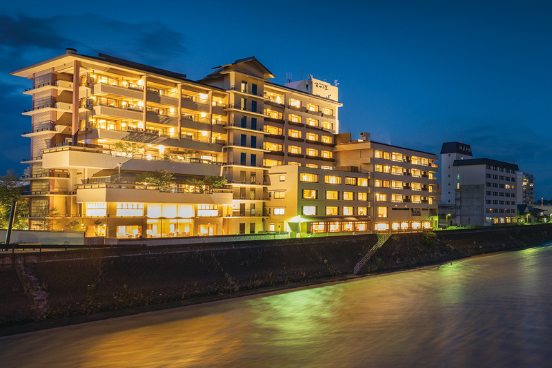 1941年創業。全74室で、露天風呂付客室が21室、半露天風呂付客室が2室ある。温泉はすべて自家源泉の「鮎里源泉」の湯を利用。鮎など地元食材を使用した料理を楽しめる。