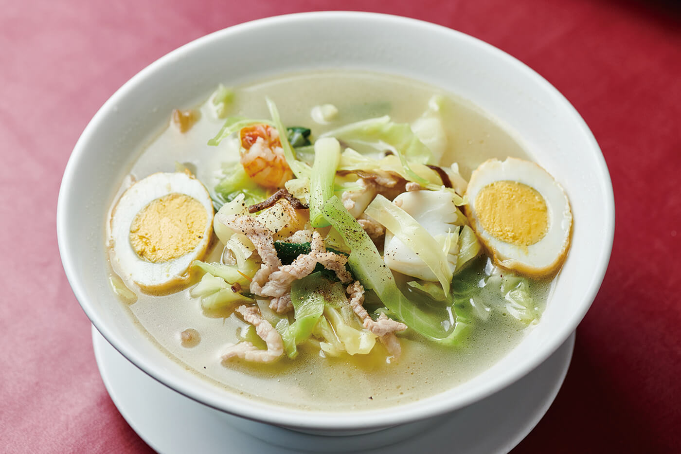 熊本の郷土食といったら「太平燕(タイビーエン)」。もともと中国福建省の郷土料理で、長崎に伝わり、熊本でアレンジされ定着しました。春雨をメインに、炒めた野菜や肉などを入れた中華風スープで、上に揚げ卵がのっています。下通(しもとおり)アーケードにある「紅蘭亭(こうらんてい) 下通本店」の「太平燕」は、鶏ガラと豚骨のスープであっさりした優しい味わい。九州産の新鮮な食材を使用し、キャベツは甘みたっぷり。創業当時から変わらない味を守り続けています。