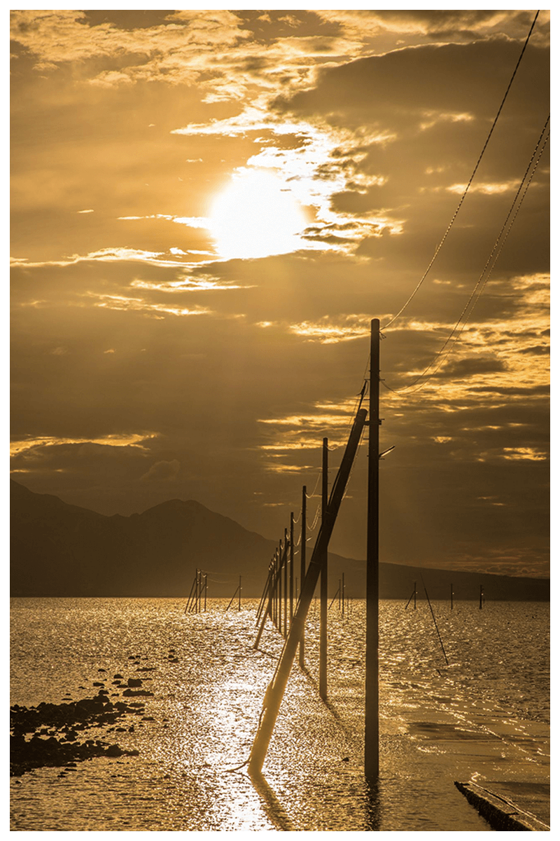 満潮を迎え、夕日を背景に道が海に沈んでいく。奥には雄大な雲仙・普賢岳を望む。暗くなると船が座礁しないように電柱に明かりが灯り、より神秘的な光景に。