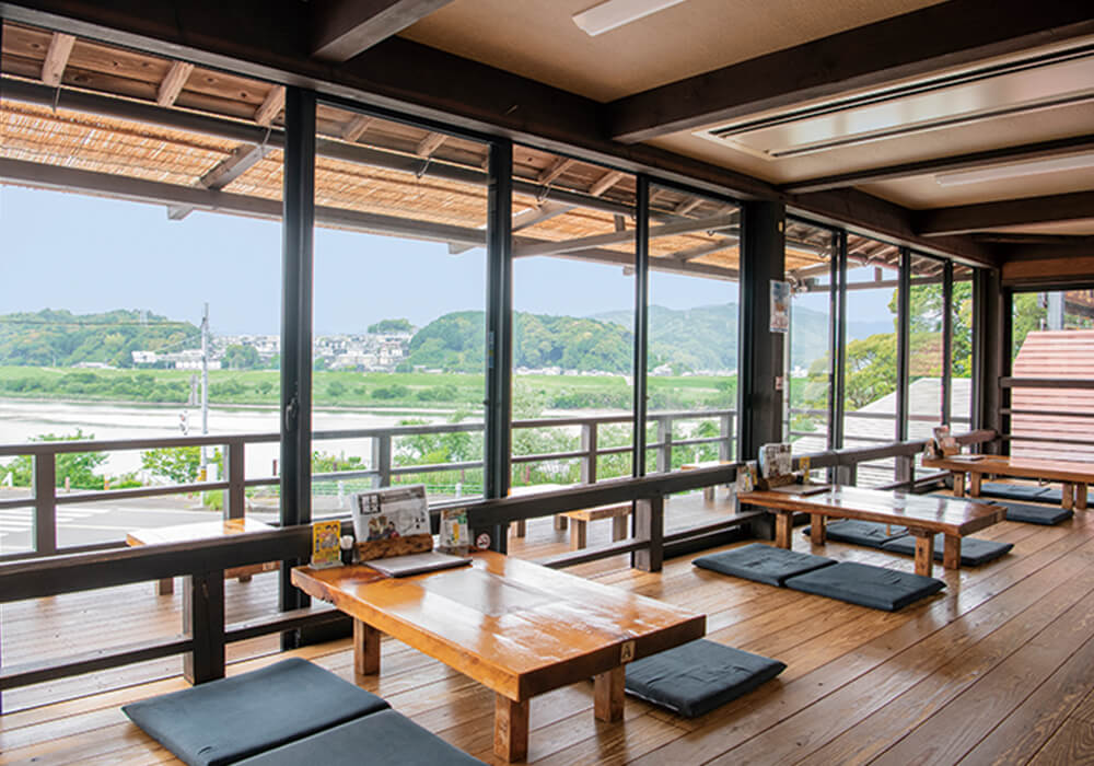1967年創業。もともと四万十川で獲った魚料理をふるまう川漁師の店だった。縁側のテラス席からは四万十川を眺められる。1階はお土産売り場で、四万十屋オリジナル商品や四万十の地場商品が購入できる。