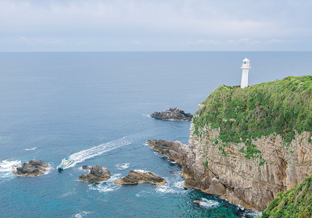 高知県の西南部に位置する宿毛湾(すくもわん)。宿毛湾の南に突き出た大月半島と二本の橋でつながる周囲約4kmの島が柏島です。一番の魅力はエメラルドグリーンの美しい海。船が宙に浮いて見えるほどの透明度を誇ります。豊後水道(ぶんごすいどう)と黒潮がぶつかる海域に面しているため、生息する魚の種類が豊富です。その数は日本の海に分布する3分の1、約1千種におよぶといわれています。その柏島を一望できるのが「大堂山(おおどうやま)展望台」。大月半島の南側にある大堂海岸から柏島へ向かう途中、大堂山の山頂に位置します。標高246・9mの頂(いただき)から眺める360度のパノラマは絶景です。