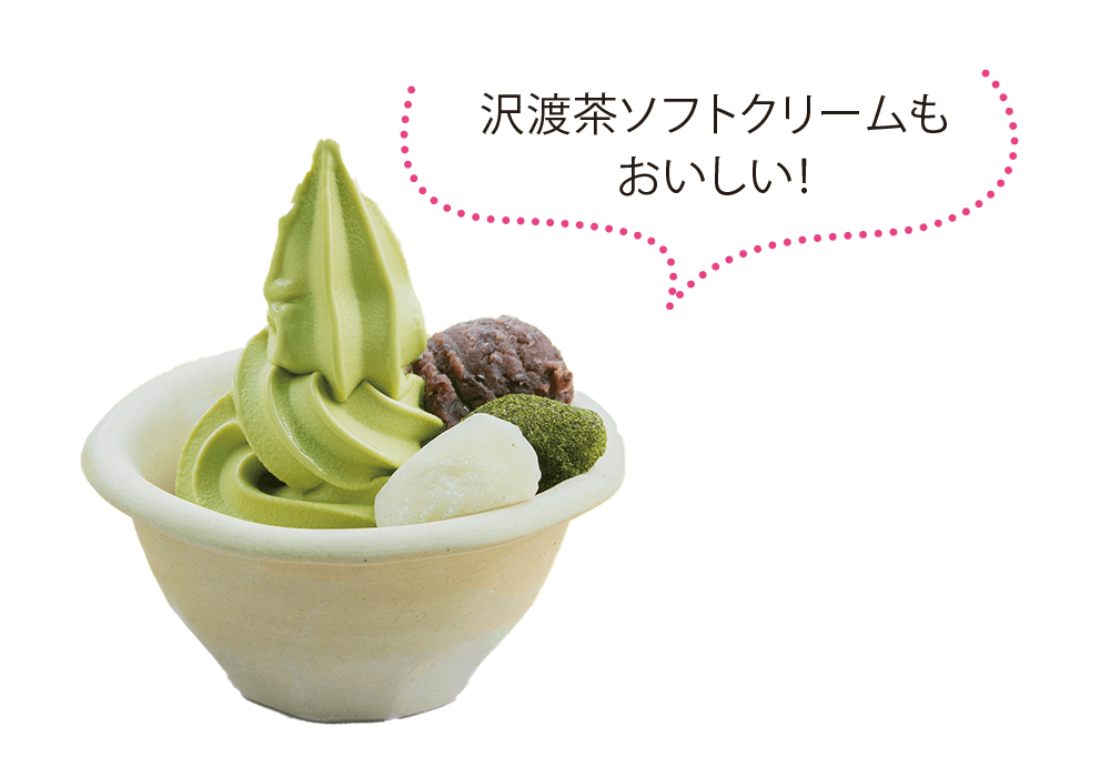 沢渡茶のほか、茶葉や地元の食材を活用した料理、スイーツを提供するカフェ。スムージーやラテ、ソフトクリームなどはテイクアウトも可能。茶葉も購入できる。