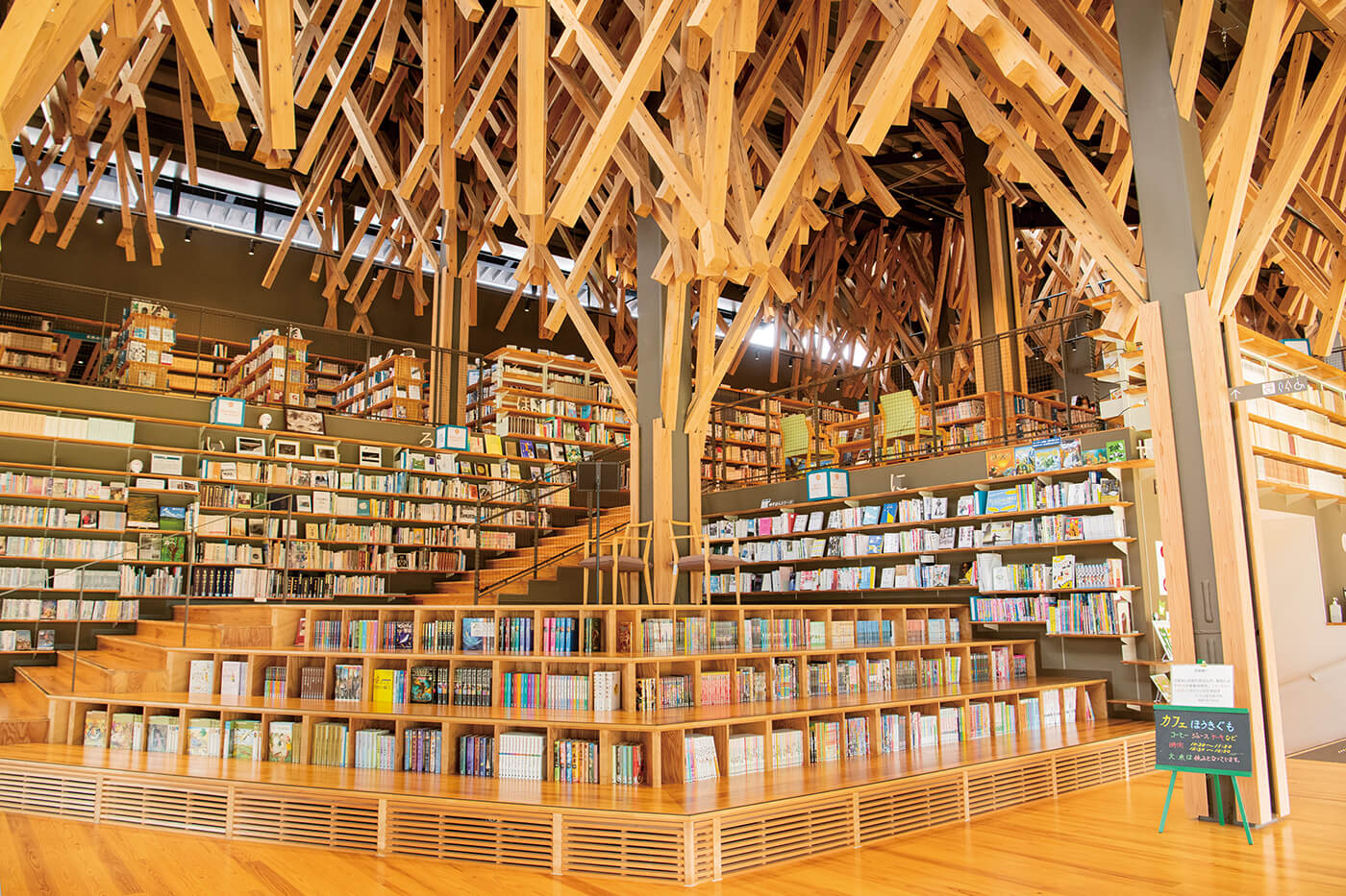 建築家の隈研吾氏が設計した「雲の上の図書館」も、梼原産の木材がふんだんに使われています。靴を脱いで入館すると、天井から無数の木組みが目に飛び込んできます。足元から木のぬくもりが感じられ、木の香りがただよい、まるで森の中にいるよう。