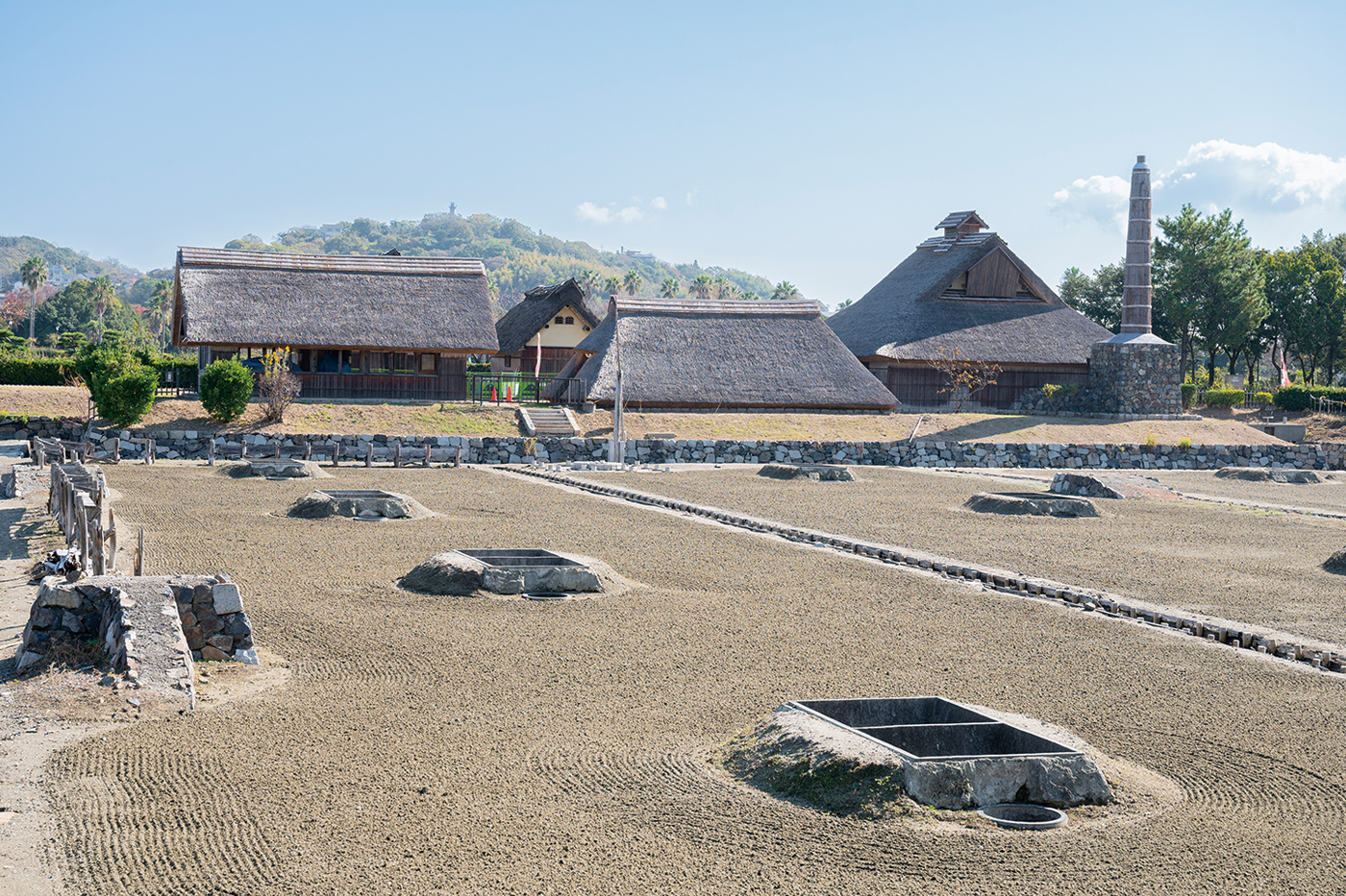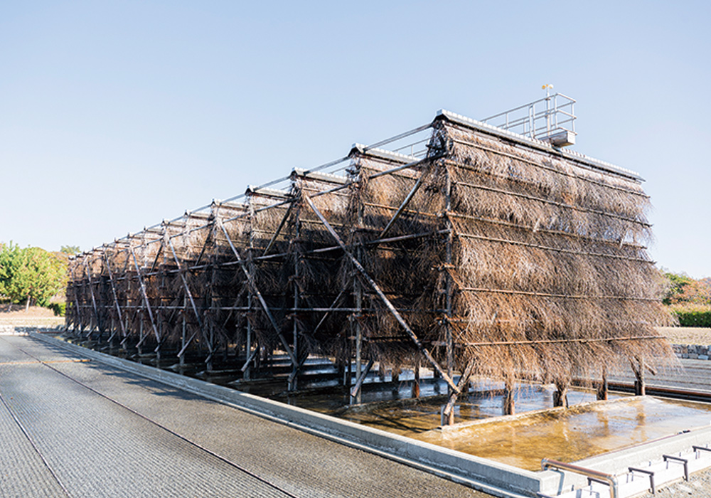 赤穂の塩づくりについて学んだあとは、「赤穂市立海洋科学館・塩の国」へ。広大な敷地内に入浜式塩田など3つの塩田が復元されています。塩田でつくったかん水(濃い塩水)を煮詰めて塩をつくる釜屋も復元されており、釜炊きの風景を想像できます。昭和20年代後半から主流となった流下式塩田(りゅうかしきえんでん)も稼働し、実際にかん水をつくっています。そのかん水を煮詰めて塩をつくる「塩づくり体験」は、大人も子どもも夢中になれておすすめです。