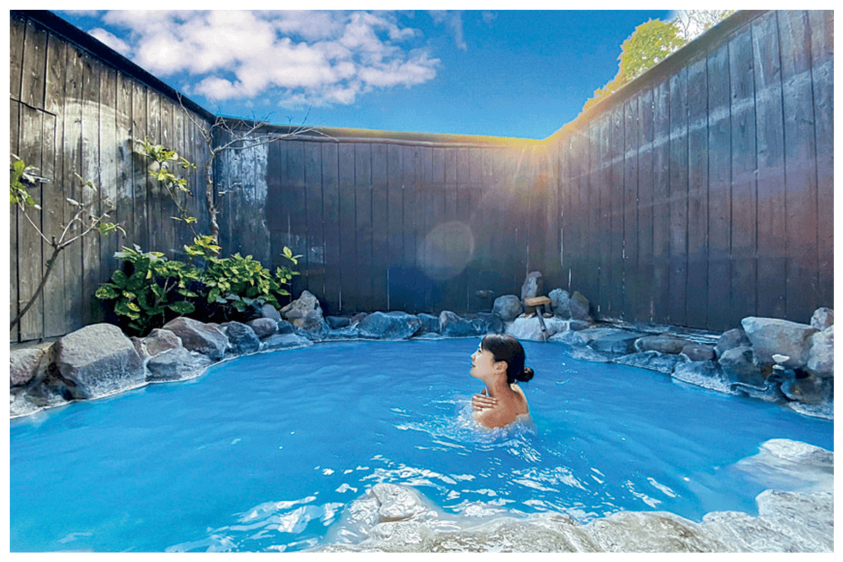 別府・鉄輪温泉の中心部から離れた閑静な山麓に佇む温泉旅館。日帰り入浴では貸切風呂を利用でき、「照湯」という部屋を選ぶと、日本で数えるほどしかないとても希少な「青湯」に出合えます。美しいこの湯の泉質は、まるで濃厚化粧水のようなとろんとろんの心地よい肌ざわり。天然の保湿成分といわれるメタケイ酸が温泉の基準値の15倍近くも含まれた美肌の湯で、さらに塩分が肌に膜をつくることで、体内の水分や熱を外へ逃がしにくくし保湿効果も高くポカポカに。広い露天風呂で家族や友人と贅沢な時間を過ごしてみてください。