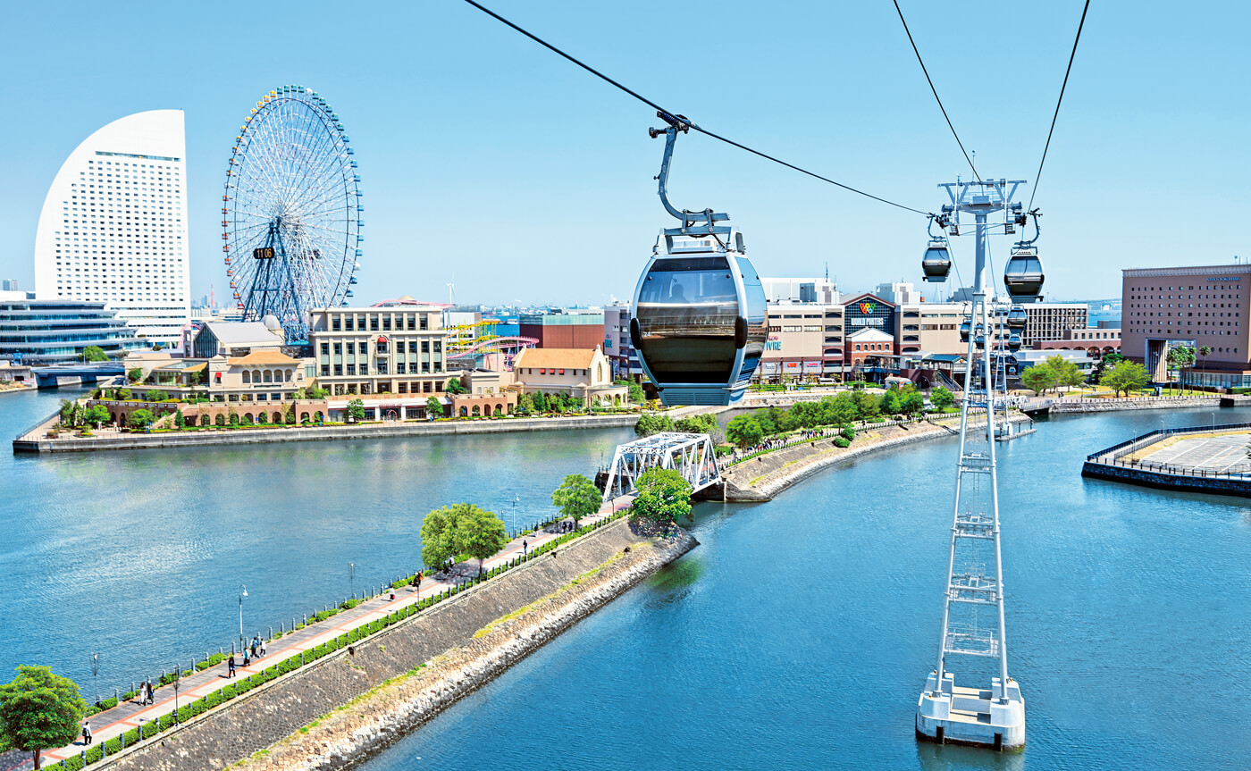 JR桜木町駅を出ると、青空の下、ふわりと空中を横切るYOKOHAMA AIR CABINが目に飛び込んできました。日本初の都市型循環式ロープウェイとして2021年4月に開業したこの乗り物は、桜木町と運河パーク間の630mを結んでおり、連日行列ができるほどの人気を集めています。