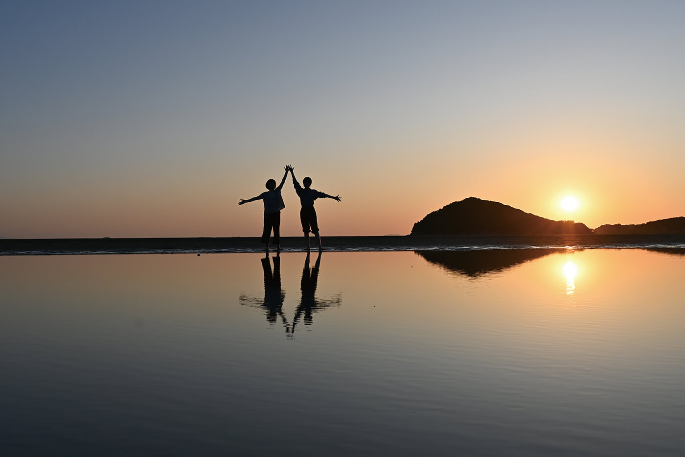 「撮るよー」、「全員ジャンプしてー」。三豊市仁尾町の父母ヶ浜を訪ねると、平日にもかかわらず、大勢の人が写真撮影を楽しんでいました。人気の理由は、砂浜の潮だまりを利用して鏡映しのような写真が撮れること。干潮時で雨風がなければ撮影できますが、おすすめは干潮と日没が重なる時間帯です。潮だまりが大きな鏡となり、夕空のグラデーションを映し出します。