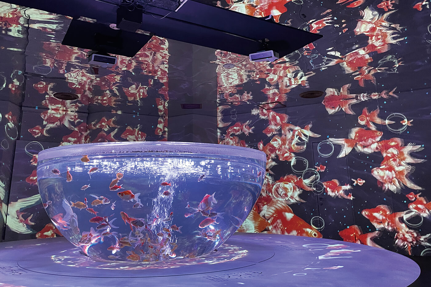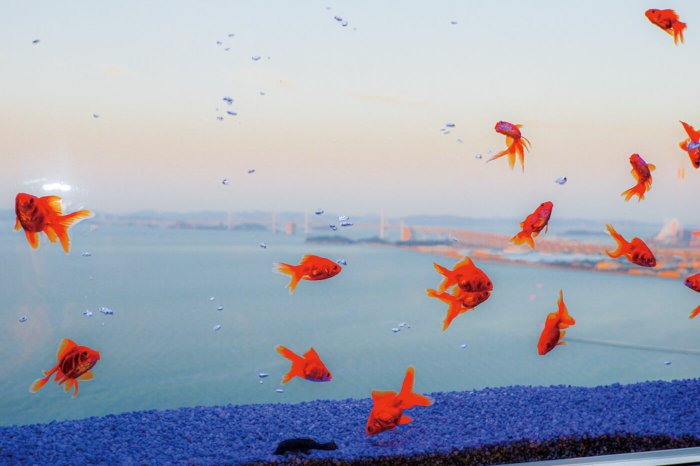 瀬戸内海を一望できるゴールドタワーの展望フロアにある地上127mのアクアリウム。3000匹を超える金魚と熱帯魚が瀬戸内の空を泳いでいるかのような幻想的な空間が広がっている。週末や祝日は22時まで営業。