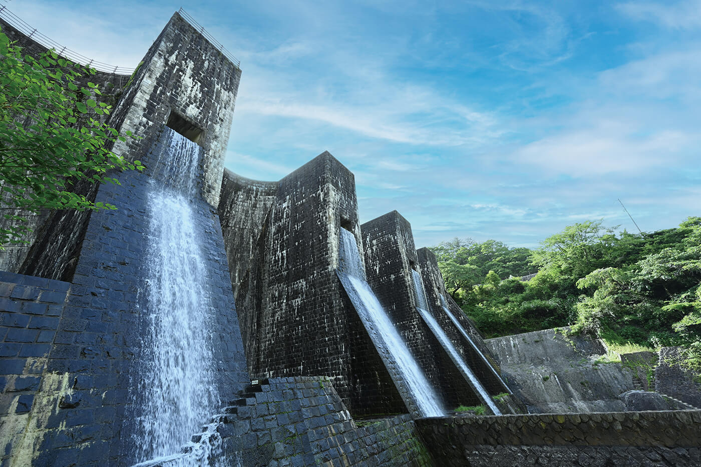 柞田川(くにたがわ)上流にある、中世ヨーロッパの城壁を思わせるダム。流域の干ばつを解決するため、大正末期に地元農家を動員して着工、1929(昭和4)年に完成した。国の重要文化財で、現在も農地の水がめとして活躍中。