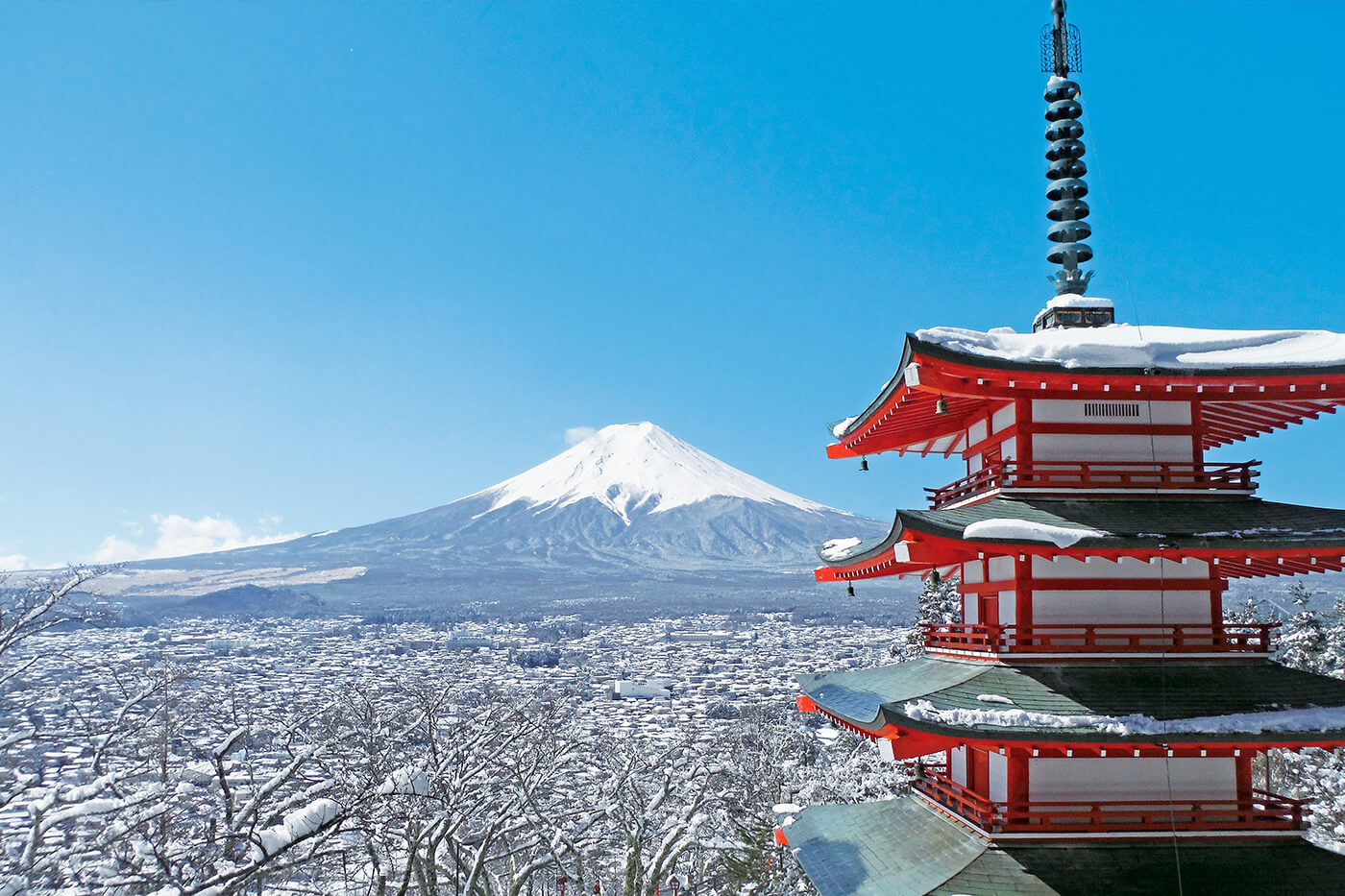 ある晴れた日、富士吉田市の新倉山浅間公園を訪ねました。この公園は新倉富士浅間神社の敷地内にあるため、まずは山の麓から階段を登って、神社の境内に向かいます。お参りを済ませたら、境内の脇から山の中腹へ続く長い階段を登っていきましょう。階段につけられた「咲くや姫階段」の名は、神社の御祭神で、富士山の神様でもある木花咲耶姫命(このはなさくやひめのみこと)にちなんだもの。「さくや」の名前に合わせて398段あります。ゆっくり登って15分とのことですが、途中で足が動かなくなり、息を整える人も多くいました。なんとか階段を登りきると、戦没者慰霊の五重塔「忠霊塔」があり、その背後に展望デッキが設けられています。ここから眺める富士山の見事なこと!手前に立つ忠霊塔や新倉山の木立が完璧なバランスで調和する風景は、日本を象徴する景色のひとつとして、外国人旅行者にも人気です。