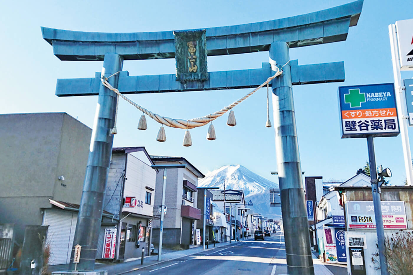 商店街を富士山に向かって進むと「金鳥居(かなどりい)」。この先は神様の領域とされており、「御師」の宿坊が並びます。富士講の人たちはここで宿泊し、お祓いを受けて登山に向かいました。