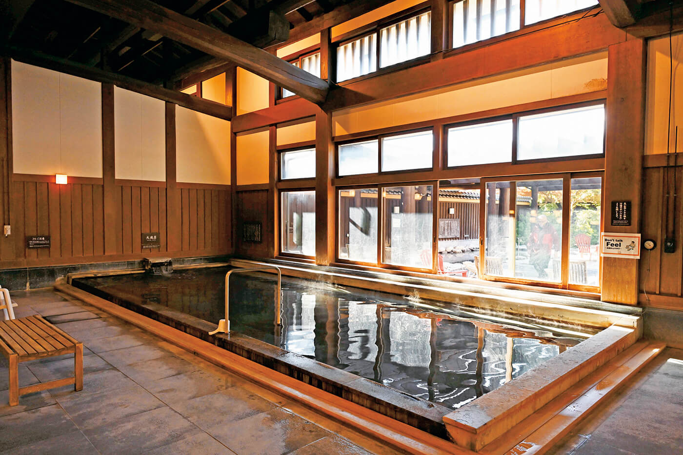 絶叫マシンで有名な「富士急ハイランド」の隣にある、「ふじやま温泉」は全国的にも珍しい「マグネシウム・カルシウム・ナトリウム‐炭酸水素塩・硫酸塩・塩化物泉」という、すべての泉質の温泉がブレンドされた天然温泉で、美肌の湯として人気です。樹齢200年超えのケヤキの大木を柱に据えた「純木造浴室」は、釘を使わない伝統工法で梁が組まれており、レトロな雰囲気のなかで良質のお湯を楽しめます。お風呂上がりには、3階の展望休憩室や4階の岩盤浴スペースへ。美しい富士山を眺めてくつろぐ、至福の時間を過ごせます。