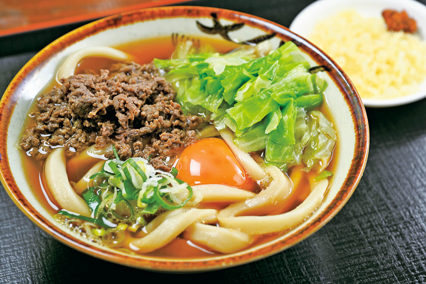 都留市の「山もとうどん」は、遠方からも多くの人が訪れる人気店です。主人の酒井建一さんが打つ麺は、うどんの概念をくつがえすほどの太さと長さ。食べ応え満点の麺をひと口噛めば、小麦の香りと味が一気に広がり、醤油と味噌のコクのある出汁、まろやかな卵と混然一体に。「肉うどん」に馬肉が使われ、キャベツがのせられているのも吉田のうどんならではです。唐辛子ベースの薬味「すりだね」と天かすで、好みの味を作りながらいただきましょう。