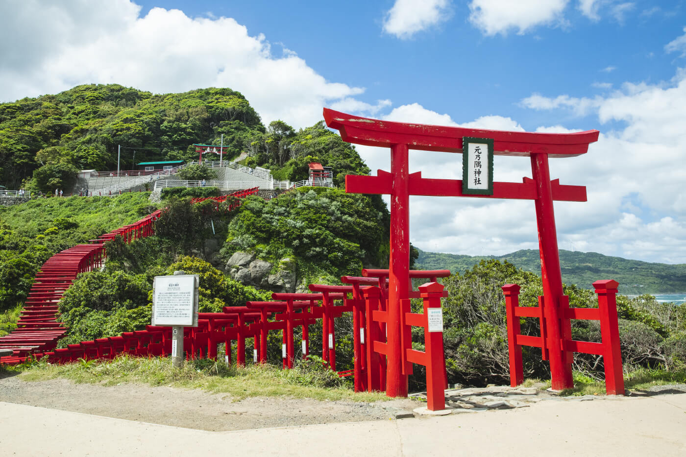 1955年、津黄漁港(つおうぎょこう)の網元・岡村斉(おかむらひとし)の枕元に現れた白狐のお告げにより建立された。100m以上におよぶ123基の鳥居は、1987年から10年かけて奉納されたもの。商売繁盛、大漁、海上安全をはじめ、良縁、子宝、開運厄除、交通安全、学業成就など多くのご利益を授ける大神として深く信仰されてきた。