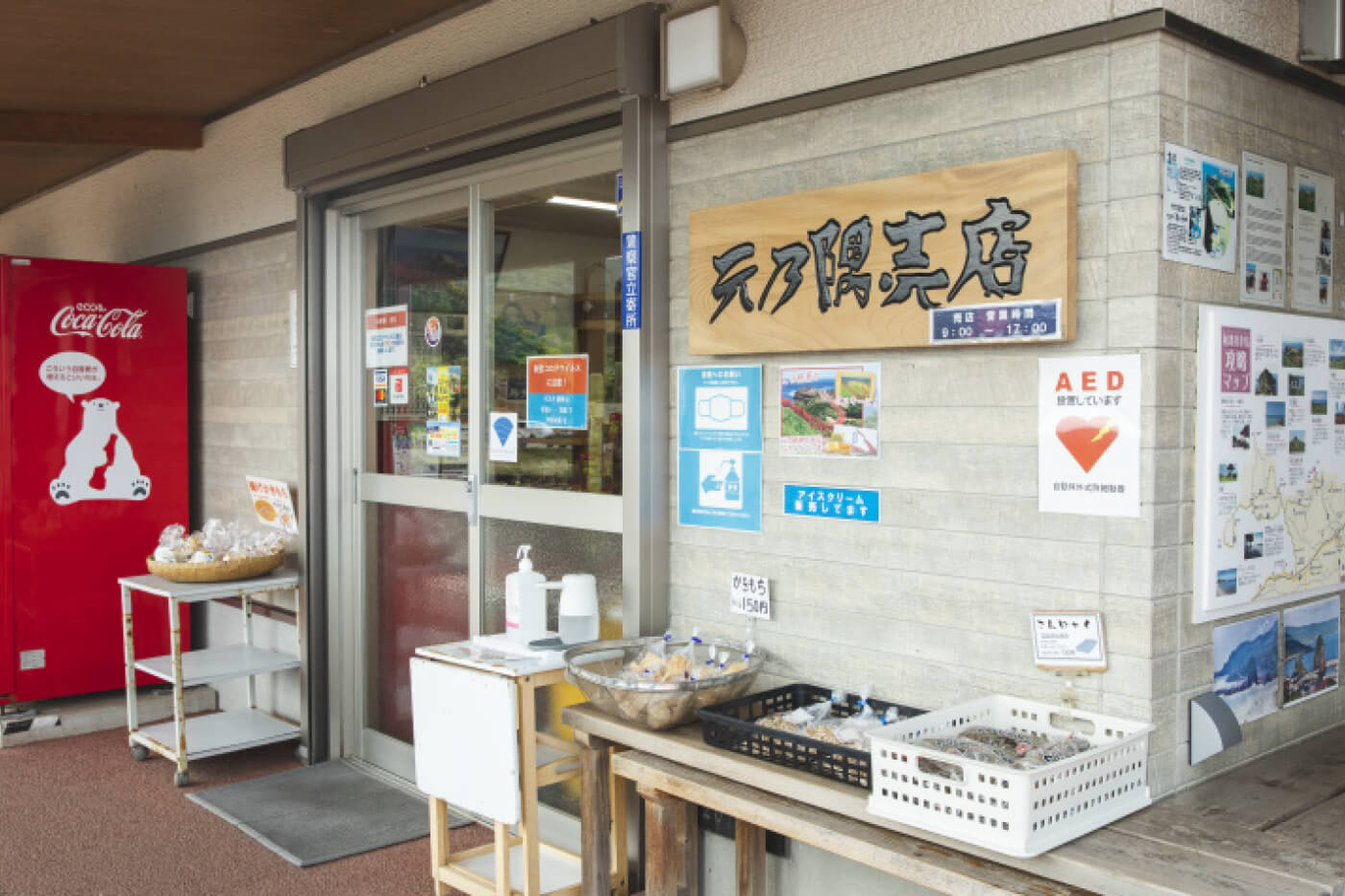 「元乃隅神社」第1駐車場に面した売店。地元の海藻類や野菜・米などを多数取り揃える。お守りぬいぐるみ「トリィネコ」のグッズもキモカワイイ。イカ釣り漁業が盛んな津黄地区住民による運営。