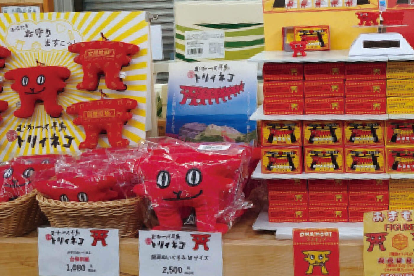 売店にも足を運んでみました。海藻類や野菜・米など、地元の生産者の方々の商品に混じって、真っ赤な「トリィネコ」のキャラクターグッズがひときわ目を引きます。 油谷といえば、油谷湾という東西に11km、南北に5kmの細長い形の湾があります。ほぼ一年中、波が穏やかで、海面はまるで美しい湖を思わせます。