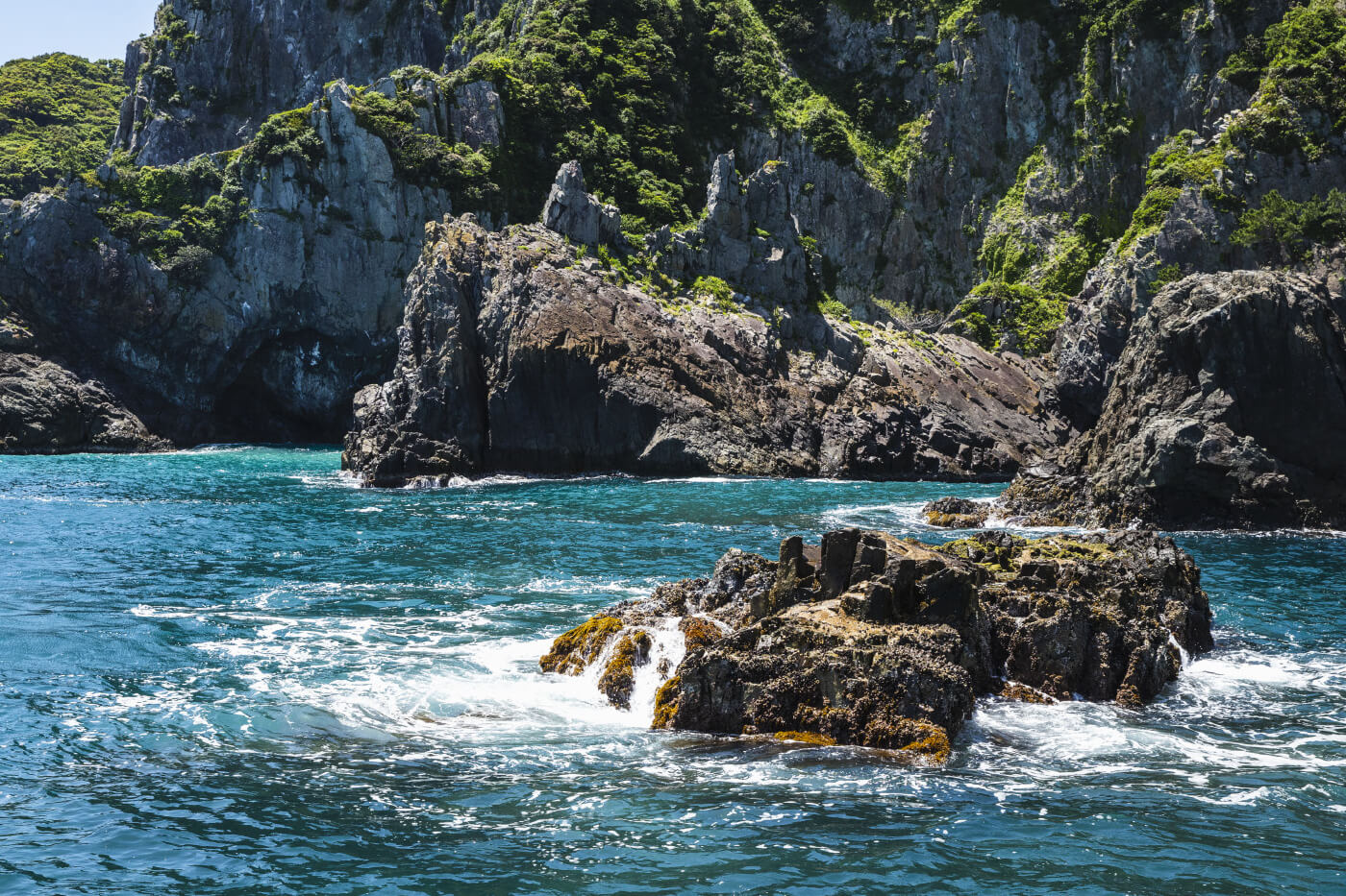 その景色を海から堪能できる「青海島観光汽船」。この日は、大島コースに乗船しました。仏の顔に見える仏岩、奇岩が連なる松島、無人島の大島など、船上からダイナミックな自然を眺められます。運が良ければ、イルカの群れに遭遇することもあるそうです。