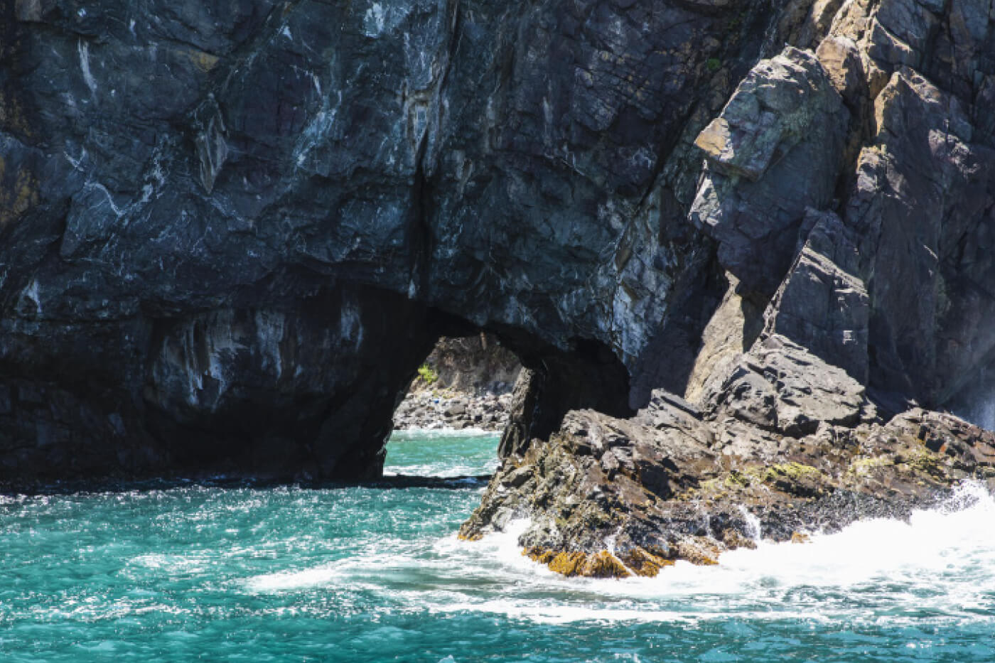 青海島の奇勝を海から探訪する観光船。波に浸食されてできた雄大な景観を間近に見ることができる。基本の1周コースは所要約1時間20分で、4つの狭い洞門を通過するスリリングな体験ができる。