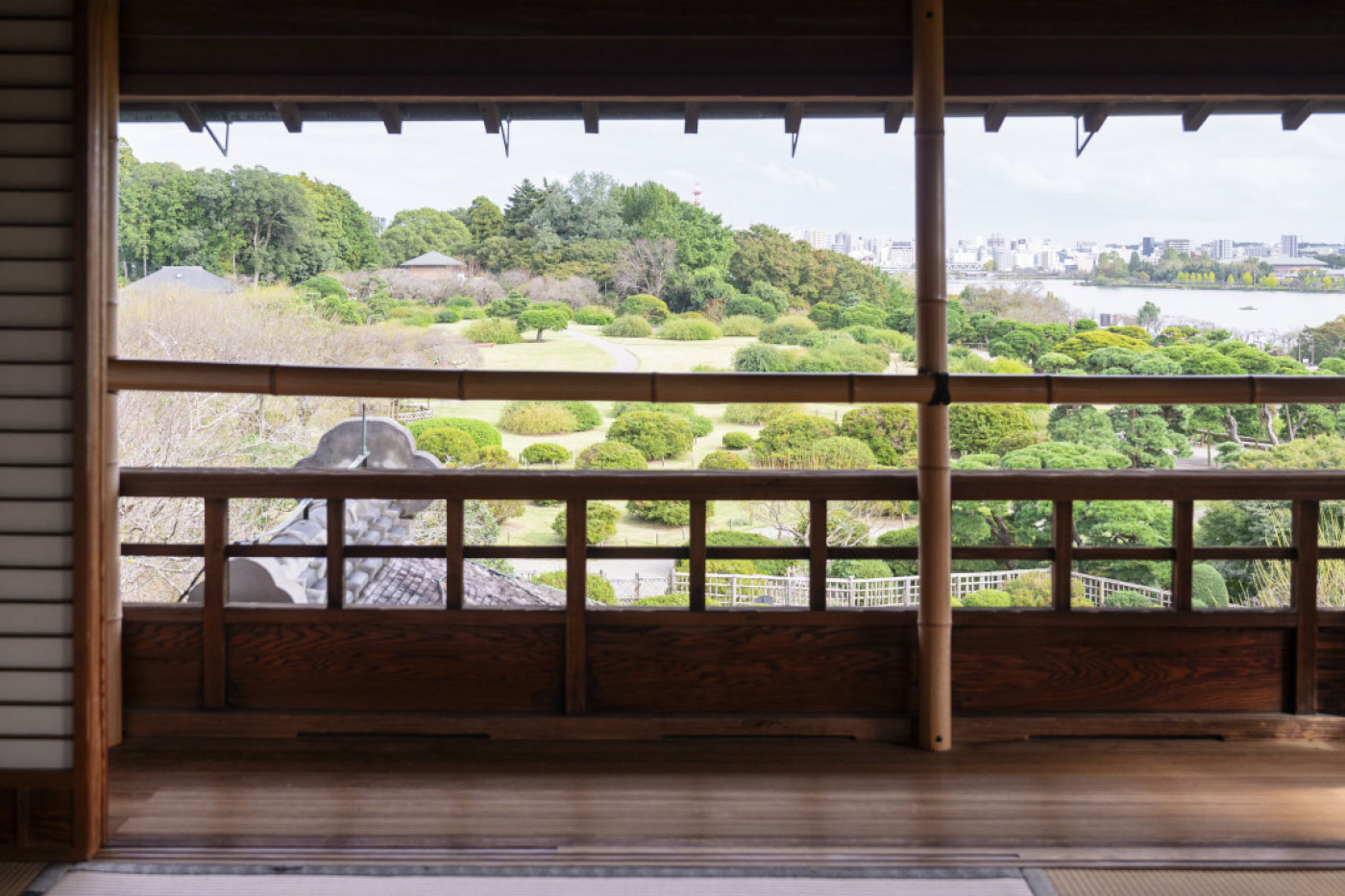 高台に静かに佇む「好文亭」にも立ち寄りました。かつて藩士や領民を集めて詩歌や養老の会が催された木造2層3階建ての別荘で、斉昭公が設計した建築意匠に目を奪われます。好文亭内にあるカフェ「樂」では、斉昭公も愛でたであろう千波湖や梅林の絶景を眺めながら、「領民と偕(とも)に楽しみたい」という願いに思いを馳せました。